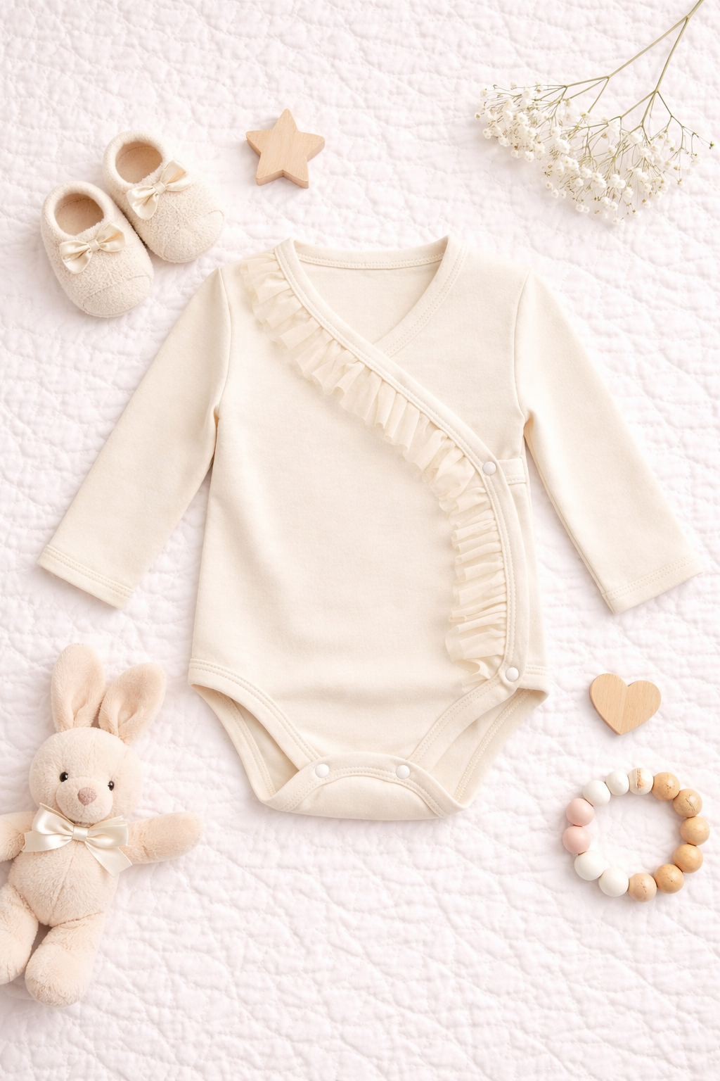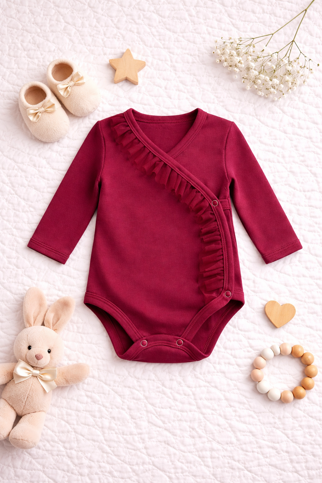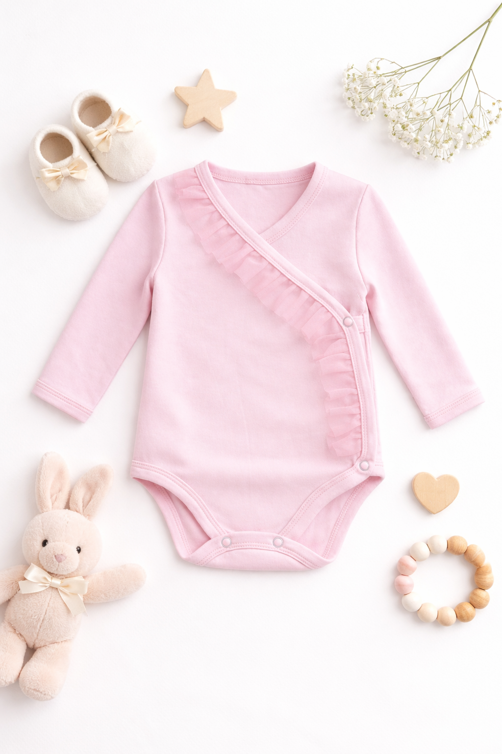 Wykonane w 100% z wysokiej jakości bawełny, body jest miękkie, przewiewne i delikatne dla wrażliwej skóry maluszka. Ozdobna falbanka nadaje całości wyjątkowego, eleganckiego charakteru – idealnego zarówno na co dzień, jak i na specjalne okazje.