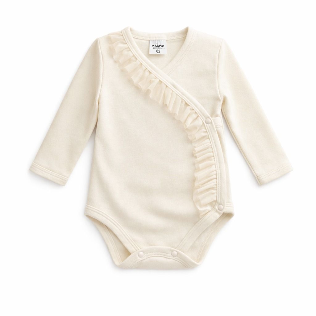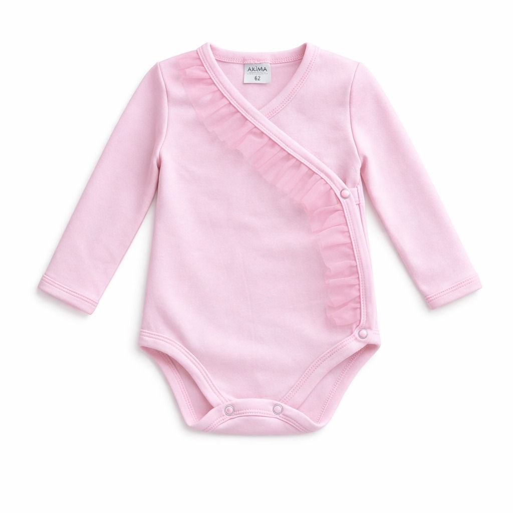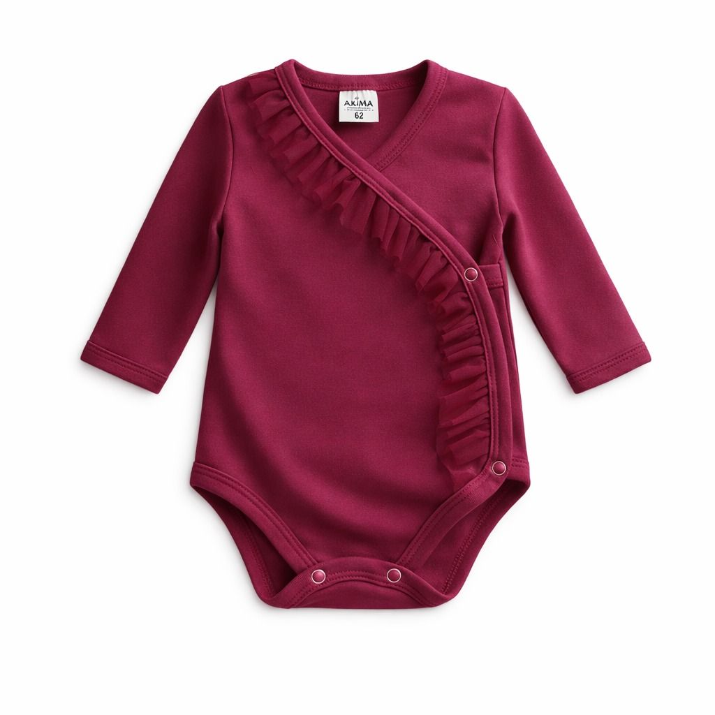 Eleganckie body kopertowe marki Axima z subtelną falbanką to doskonałe połączenie stylu i funkcjonalności. Kopertowy krój ułatwia zakładanie i zdejmowanie, co jest szczególnie praktyczne w pierwszych miesiącach życia dziecka.