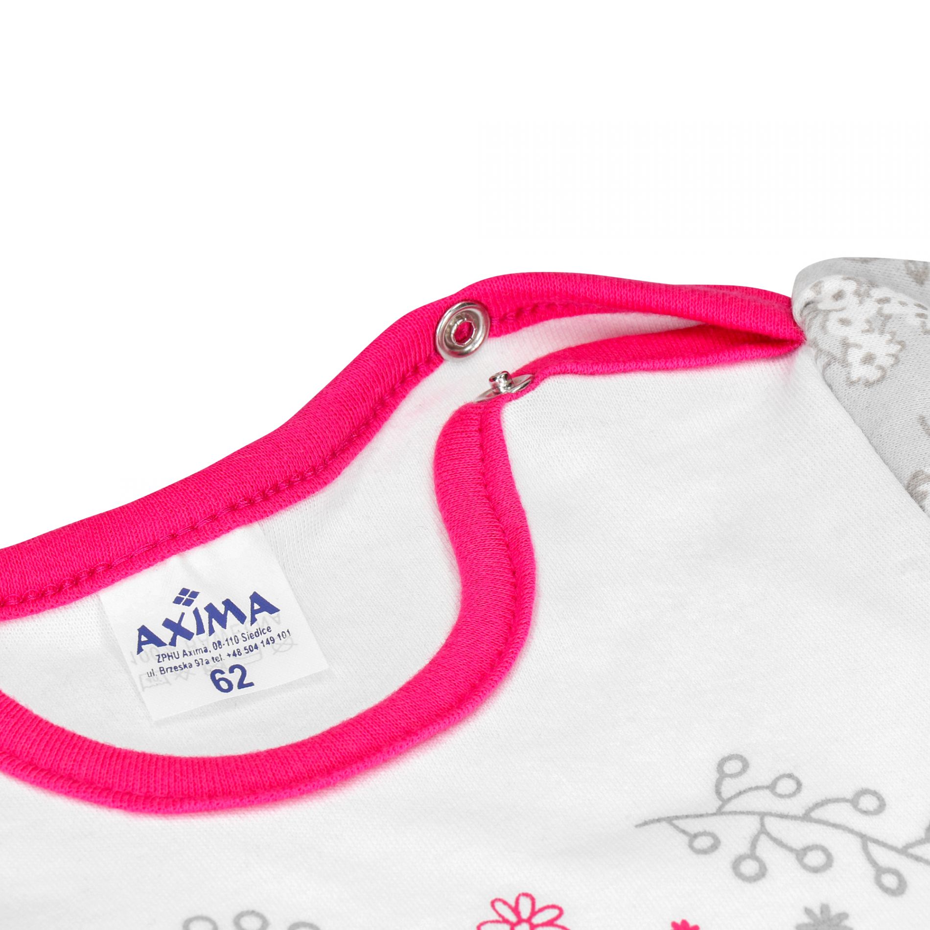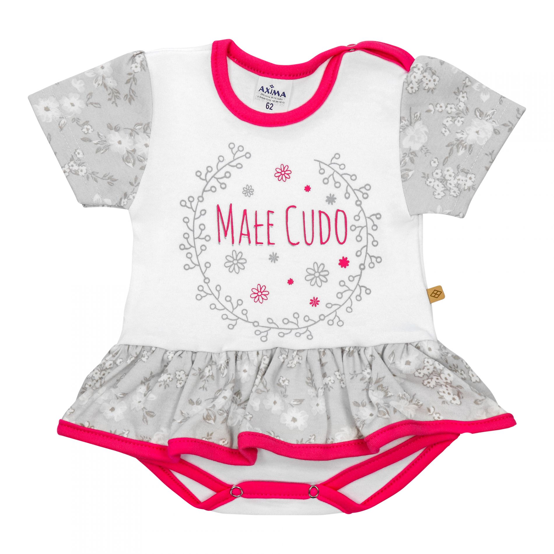 Dzianina posiada certyfikat Oeko-Tex Standard 100. Wymiary Rozmiar 62 (0-3 m-ce) Szerokość pod paszkami: 22 cmx2 Długość całkowita: 36 cm Rozmiar 68 (3-6 m-cy) Szerokość pod paszkami: 24 cm x 2 Długość całkowita: 37 cm Rozmiar 74 (6-9 m-cy) Szerokość pod paszkami: 25cm X2 Długość całkowita:39 cm Rozmiar 80 (9-12 m-ce) Szerokość pod paszkami: 26cm x 2 Długość całkowita: 40 cm Rozmiar 86 (12-18 m-ce) Szerokość pod paszkami: 27cm x 2 Długość całkowita:45 cm